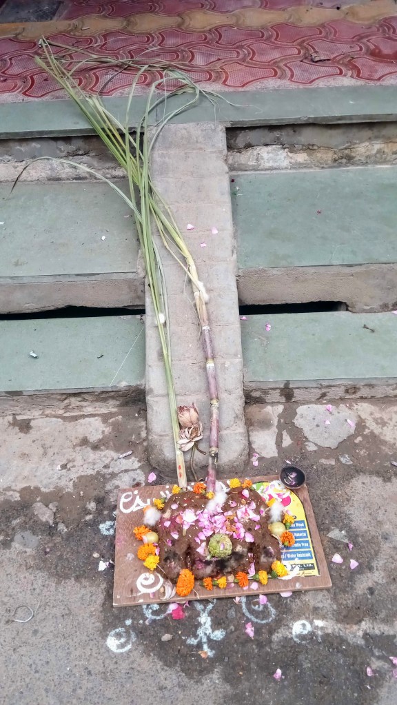 Bouse de vache, couronne d’œillets et offrandes (canne à sucre et fruits)