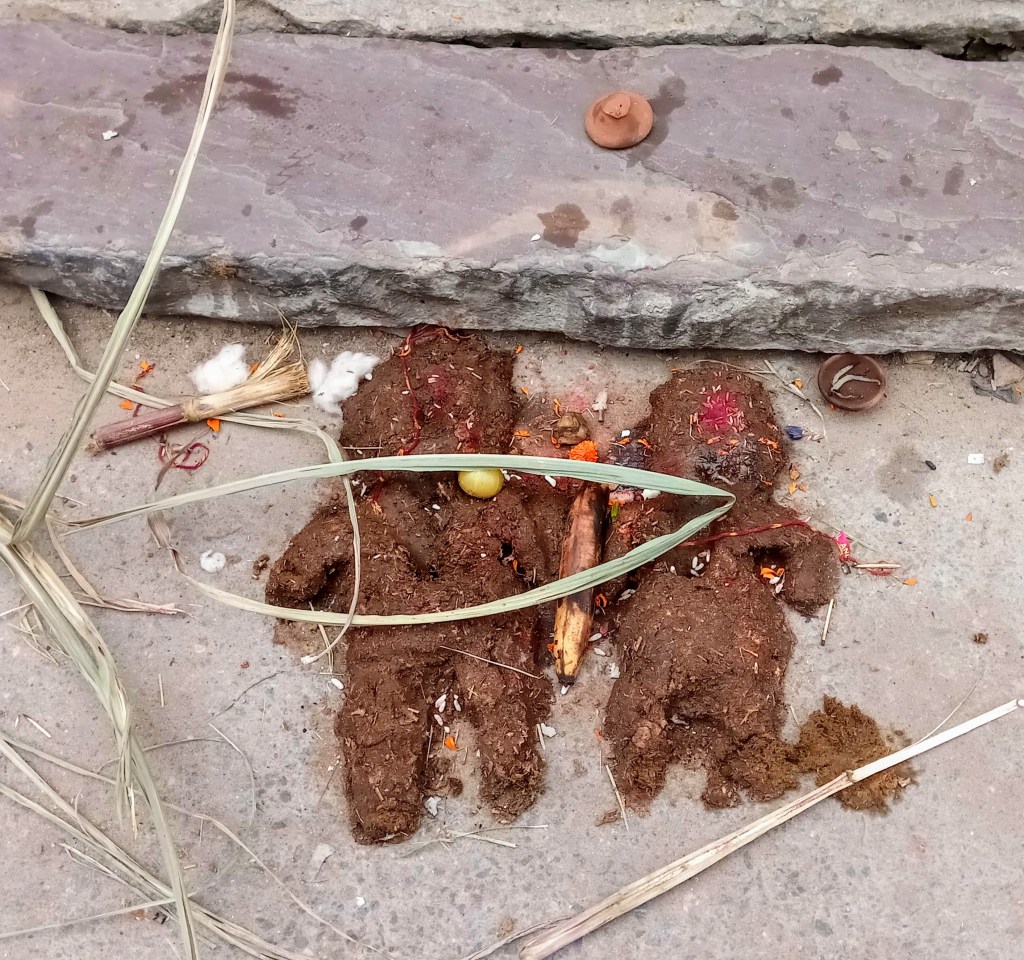 ou avec de la bouse de vache modelée en forme de bonhomme avec des fleurs. Il faut faire attention à ne pas marcher dedans, il y en a partout !