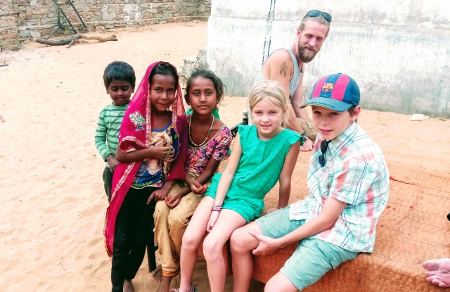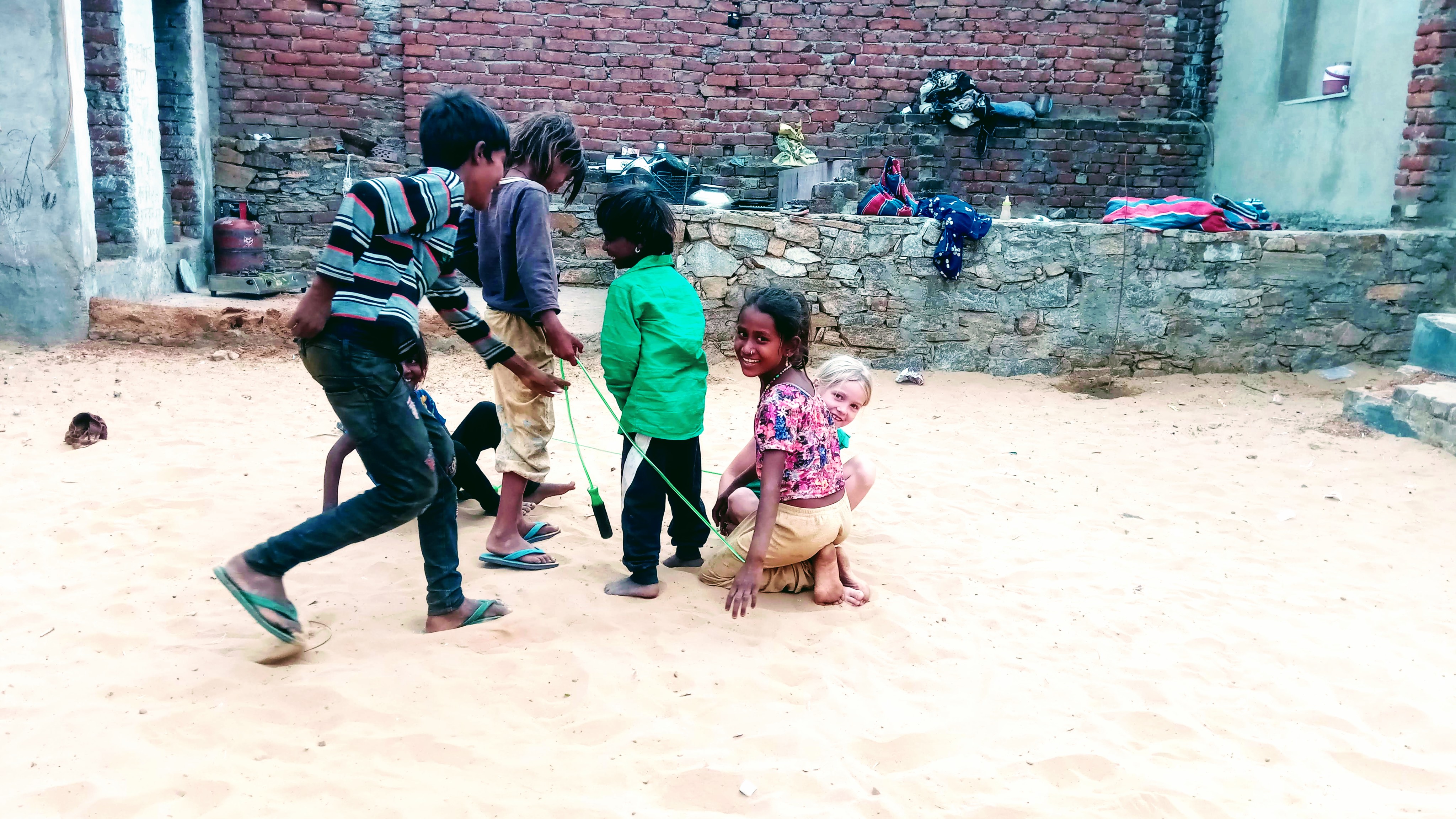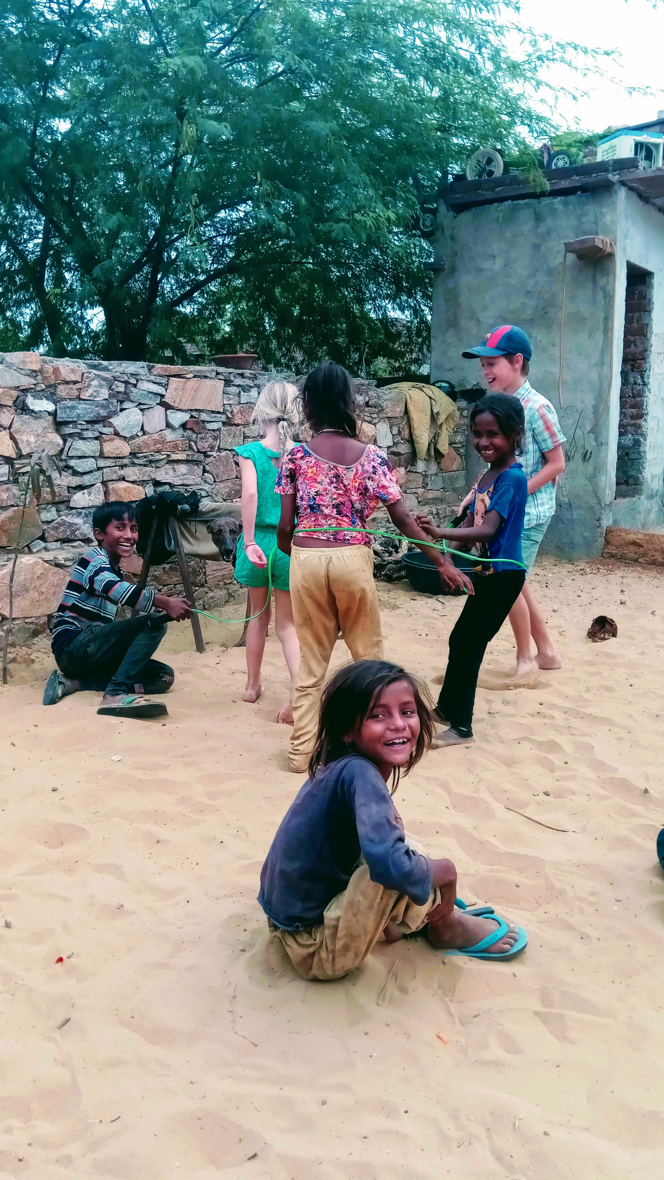 Pendant que les adultes prenaient un chaï (mélange lait/thé/épices) sur un lit dehors, on jouait avec des cordes à sauter.