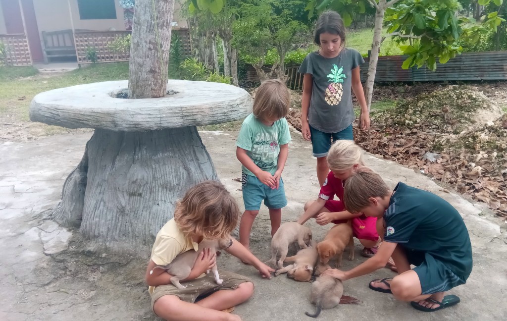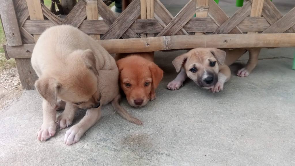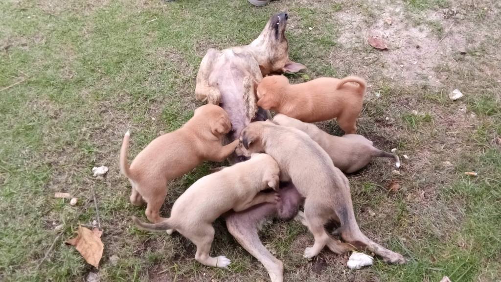 Il y avait 5 petits chiots trop mignons et aussi il y avait 4 chiens qui attaquaient un autre, qui restait toujours à l »écart, qu’on a appelé Pattie (car elle boitait d’une patte) , elle ne venait jamais où on manger, du coup je l’ai fait venir avec du pain et elle est resté et s’est fait copine avec les autres chiens !